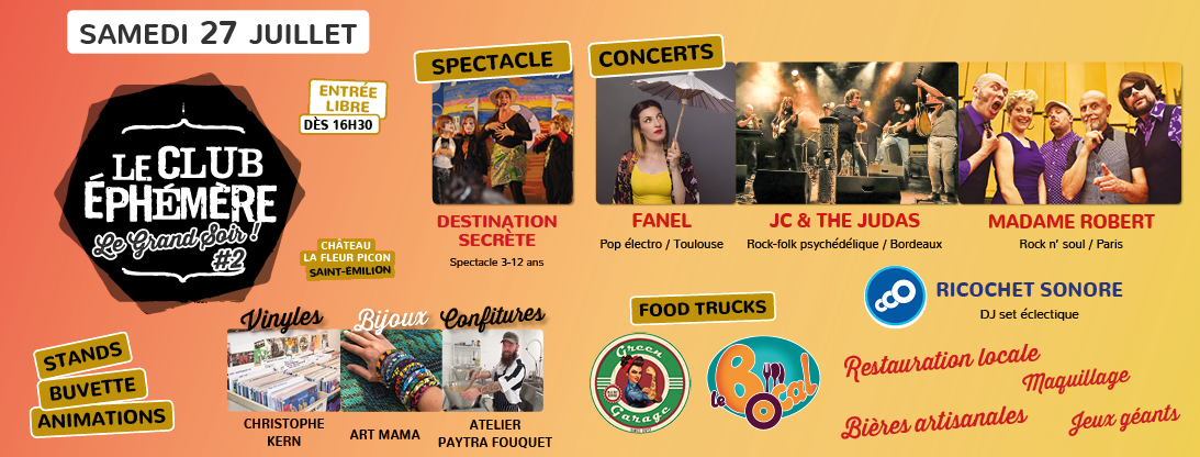Le Club Éphémère est une association de Saint-Émilion mettant en avant la musique et la gastronomie. Elle organise 4 événements dans l’année, 3 concerts et 1 festival dans l’enceinte du Château La Fleur Picon.