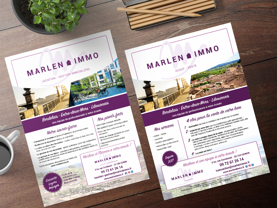 Marlène, sa dirigeante, a souhaité mettre en place une plaquette afin de présenter ses différentes facettes avec au recto, l’achat et la vente, et au verso, la location et gestion immobilière. Elle souhaitait également harmoniser l’ensemble de ses plateformes sur le Web et ses réseaux sociaux.